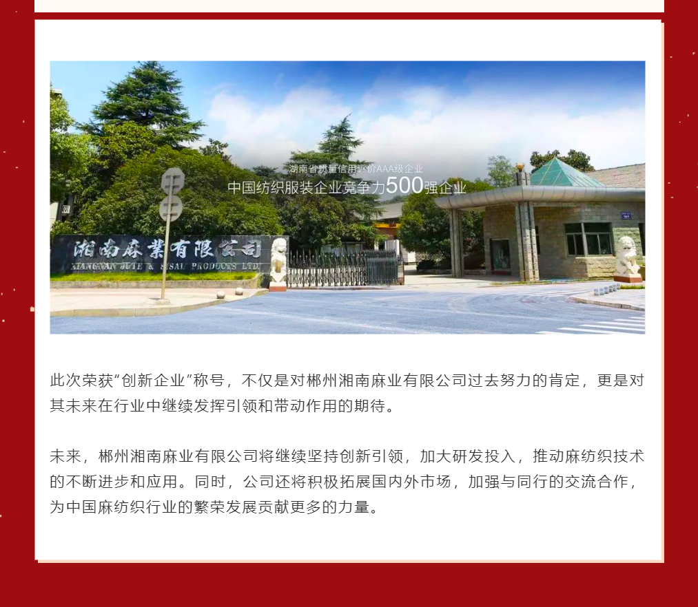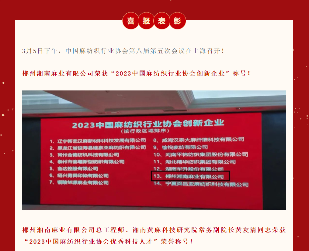 喜報(bào)|郴州湘南麻業(yè)有限公司榮獲2023中國麻紡織行業(yè)協(xié)會(huì)創(chuàng)新企業(yè)